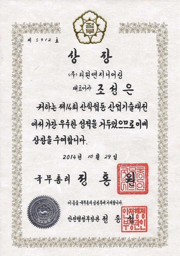 산업기술대전 국무총리상 수상 페이지 정보 작성자 티원엔지니어링 작성일18-12-13 11:53 조회2,562회 다음글 목록 본문 (주)티원엔지니어링은 제 14회 산학협동 산업기술대전에서 가장 우수한 성적으로 국무총리상을 수상하였습니다. 다음글 목록